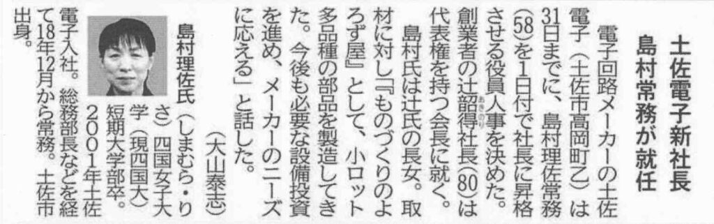 4月のTDニュースで当社の役員人事の変更内容をお知らせしましたが、地元高知新聞では、島村新社長の顔写真付きの記事を掲載するなど大きな経済ニュースとして取上げていただきました。
